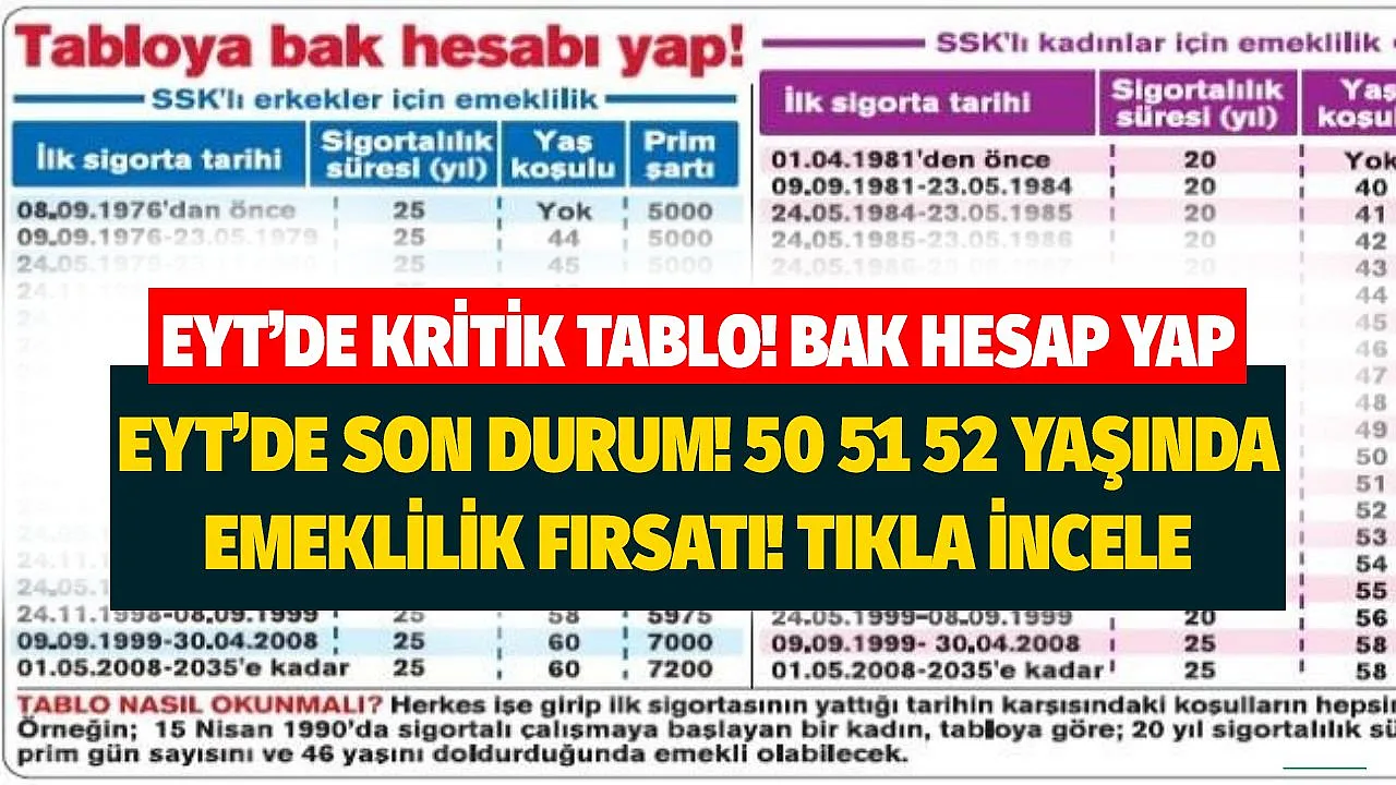 4A primiyle erken emeklilik! Tabloya bak hesabı yap: 1995 2008 öncesi sonrası yaş yıl tablosu! Ülke genelinde son dönemlerde EYT yasası üzerinde görüşmeler devam ederken çıkacak yasaya da gözler resmen çevrildi. Yasa çıkmadan önce yaş yıl tabloları paylaşılmaya devam ederken 50 - 55 yaş aralığında emekli olmak isteyen vatandaşların SGK'da kaç yıl prim ödediğiyle ilgili sorularında cevapları sorgulanıyor. İşte buna göre en güncel rehber haberimizde.