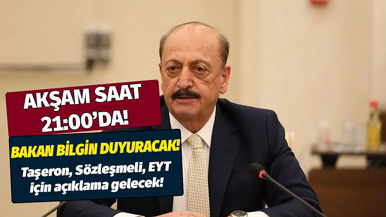 Akşam saat 21.00'da bakan duyuracak! Taşeron, sözleşmeli ve EYT için açıklama gelecek - Türkiye'de çalışanların merakla beklediği kadro ve emeklilik için detaylar yavaş yavaş netleşecek. Buna göre ise bakan Vedat Bilgin bu akşam TRT Haber'e konuk oluyor. Ülke genelinde birçok işçi sınıfı gözlerini Çalışma ve Sosyal Güvenlik Bakanlığı'na çevirdi. Bakanlıktan gelecek haber doğrultusunda birçok alanda çalışan sınıfın talepleri karşılanacak.