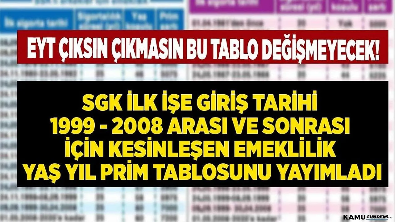 - EYT çıksın çıkmasın bu tablo kesin! İlk işe giriş tarihi 1999 2008 arası ve sonrası için kesinleşen SGK emeklilik yaş yıl prim hesaplama tablosu