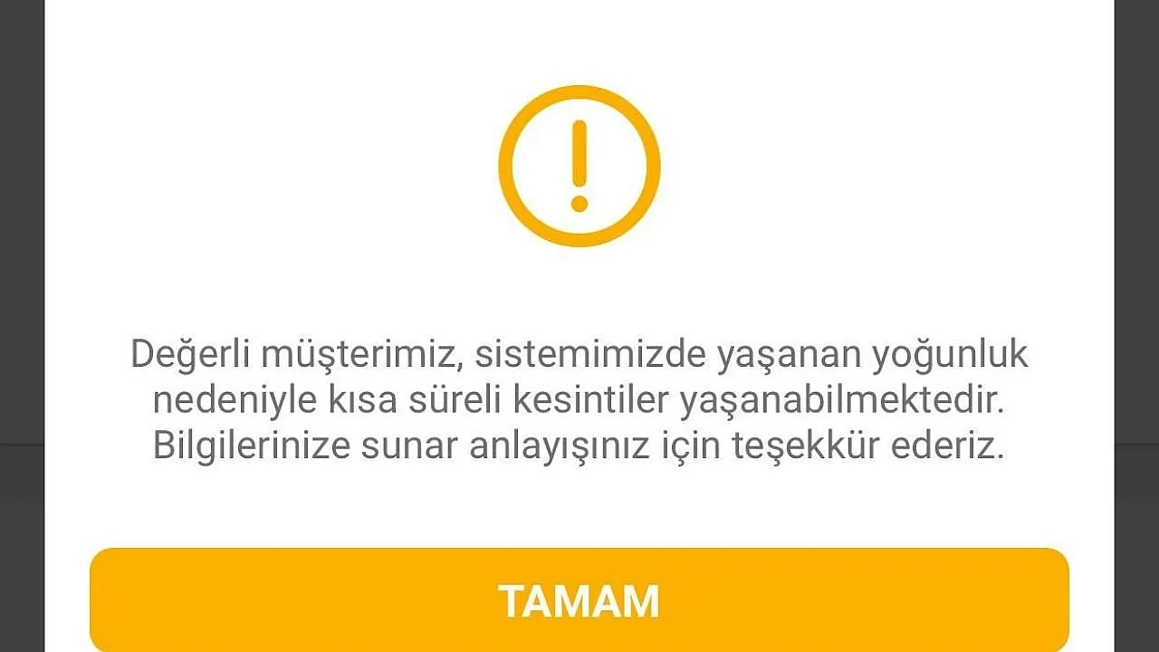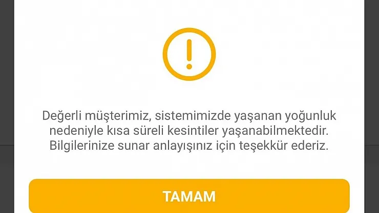 "Değerli müşterimiz, sistemimizde yaşanan yoğunluk nedeniyle kısa süreli kesintiler yaşanabilmektedir. Bilgilerinize sunar anlayışınız için teşekkür ederiz."